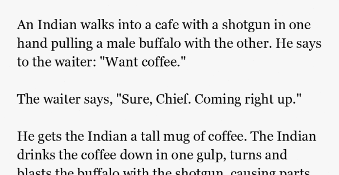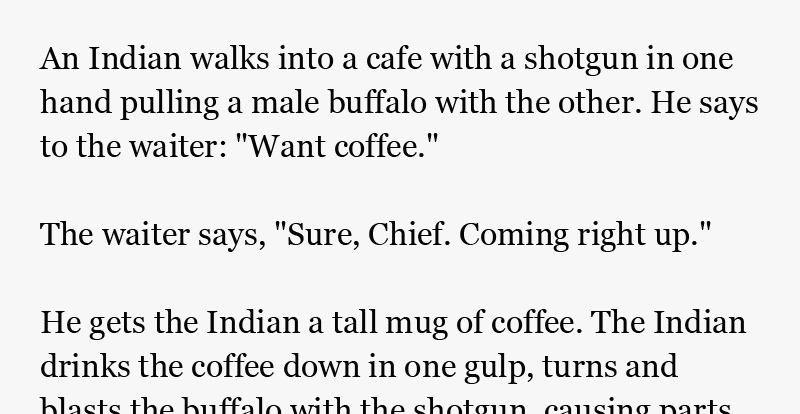 An Indian walks into a cafe with a shotgun in one hand pulling a male buffalo with the other. He says to the waiter: “Want coffee.”