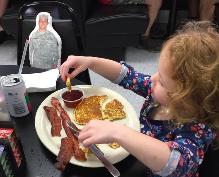 “This morning I took my kids out for breakfast, and my youngest daughter brought along her daddy doll. She likes to bring it along on our adventures as a family. She will pretend to feed it, talk to it, and act like he is with us until we are reunited as a family again. This morning strangers came up to our table after seeing the doll and thanked us for our service as a family, and some told us about the days when they served in the military. A few times strangers have cried after seeing the daddy doll and once someone told my son to take care of his family until his daddy comes home. Men and women leave their families for weeks, months, or a year and many people will never know what that is like. When we got the daddy doll I thought it would be a good way to connect our little ones to their father but in a way it has connected us to strangers too.”