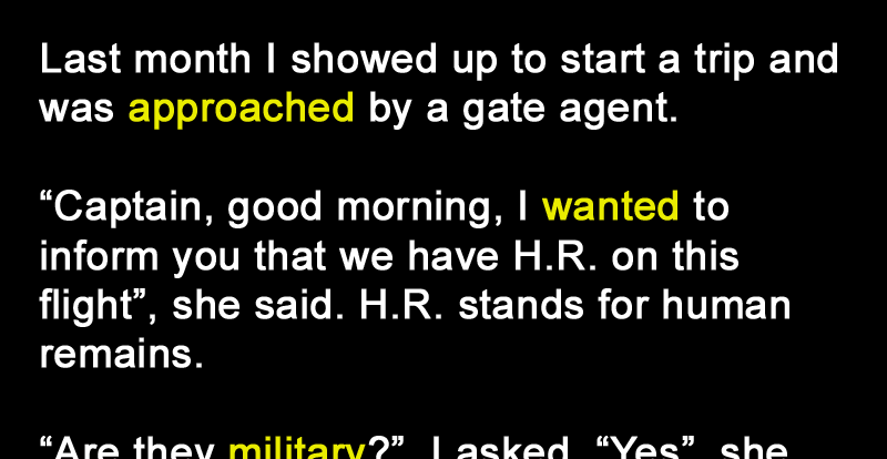 “Captain, good morning, I wanted to inform you that we have H.R. on this flight”, she said. H.R. stands for human remains. “Are they military?”, I asked. “Yes”, she said. “Is there an escort?”, I asked. “Yes, I already assigned him a seat”, she said. “Would you please tell him to come to the flight deck, you can board him early”, I said.