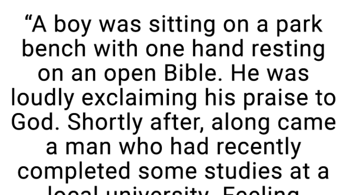 "A boy was sitting on a park bench with one hand resting on an open Bible.