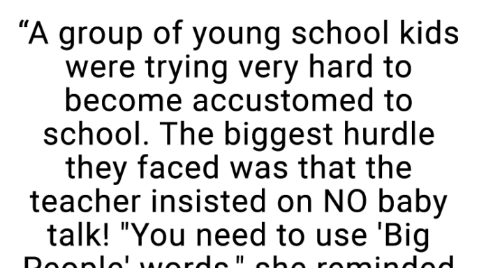 "A group of young school kids were trying very hard to become accustomed to school. The biggest hurdle they faced was that the teacher insisted on NO baby talk! "You need to use 'Big People' words," she reminded them.