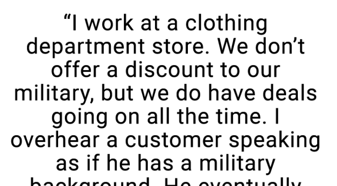 (I work at a clothing department store. We don’t offer a discount to our military, but we do have deals going on all the time. I overhear a customer speaking as if he has a military background. He eventually comes up to the counter.)