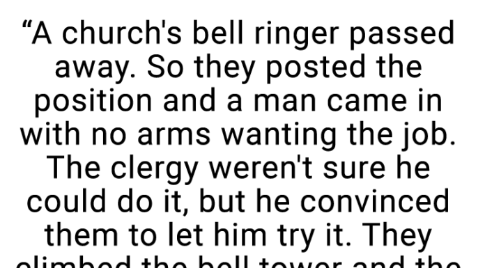 "A church's bell ringer passed away. So they posted the position and a man came in with no arms wanting the job. The clergy weren't sure he could do it, but he convinced them to let him try it.
