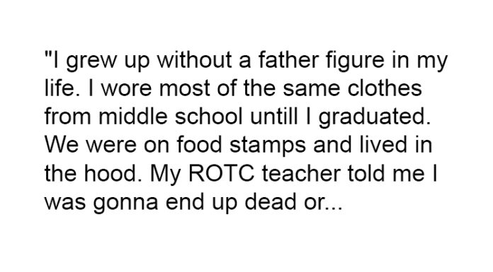 "I grew up without a father figure in my life. I wore most of the same clothes from middle school untill I graduated. We were on food stamps and lived in the hood. My ROTC teacher told me I was gonna end up dead or...