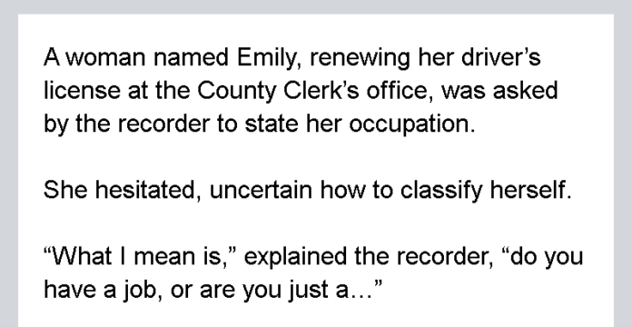 A woman named Emily, renewing her driver’s license at the County Clerk’s office, was asked by the recorder to state her occupation. She hesitated, uncertain how to classify herself.