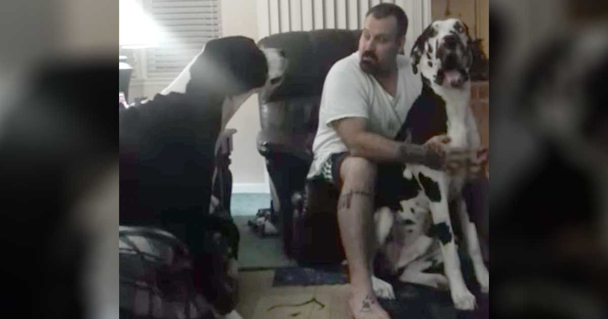 In this funny video, Dinky the great dane is throwing a minor temper tantrum because his owner is giving another dog more attention than him.