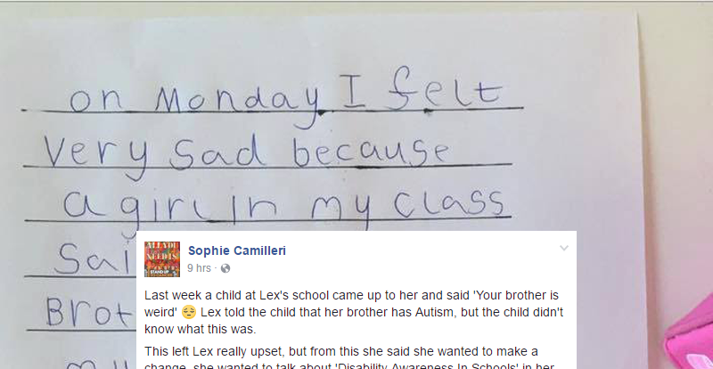 Facebook user Sophie Camilleri posted the following photo online, which has since gone viral. It shows a handwritten letter, written by her 6-year-old daughter, in response to a mean comment she overheard about her autistic brother.