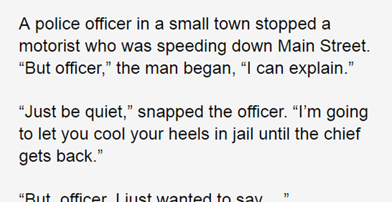 A police officer in a small town stopped a motorist who was speeding down Main Street. “But officer,” the man began, “I can explain.”