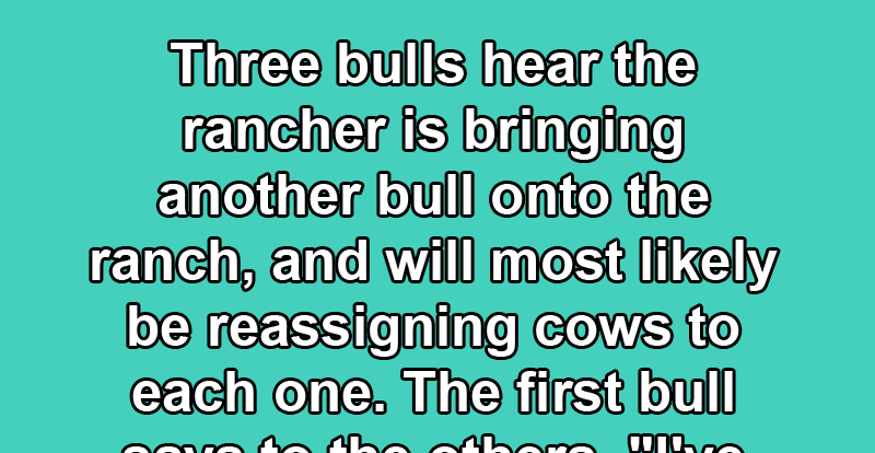 “I’ve only been here a year,” the third bull says, “and so far, you guys have only let me have ten cows. I may not be as big as you fellows, but I’m keeping all 10 of my cows.”