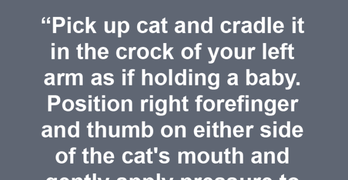 1) Pick up cat and cradle it in the crock of your left arm as if holding a baby. Position right forefinger and thumb on either side of the cat’s mouth and gently apply pressure to cheeks while holding pill in right hand. As cat opens mouth, pop pill into mouth. Allow cat to close mouth and swallow.