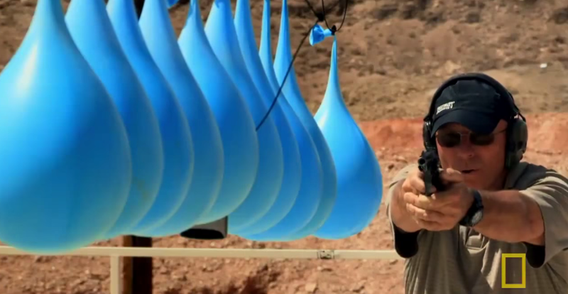 NatGeo TV ran a test to see how many water balloons it would take to stop the trajectory of a bullet. The hypothesized answers were “it won’t stop the bullets” “7 balloons will stop it” “4 balloons will stop it” or “none of the above.”