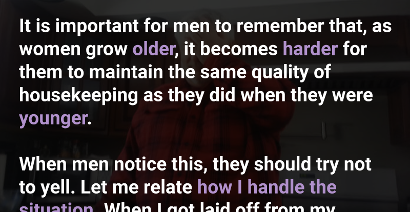 It is important for men to remember that, as women grow older, it becomes harder for them to maintain the same quality of housekeeping as they did when they were younger. When men notice this, they should try not to yell. Let me relate how I handle the situation.