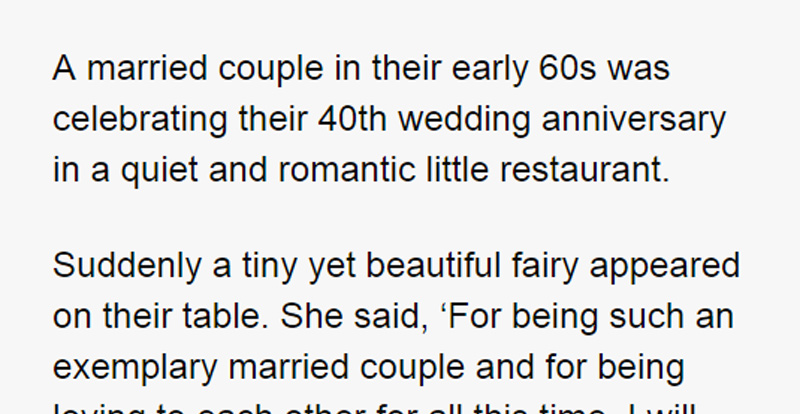 Suddenly a tiny yet beautiful fairy appeared on their table. She said, ‘For being such an exemplary married couple and for being loving to each other for all this time, I will grant you each a wish.’