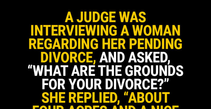 A judge was interviewing a woman regarding her pending divorce, and asked, “What are the grounds for your divorce?”