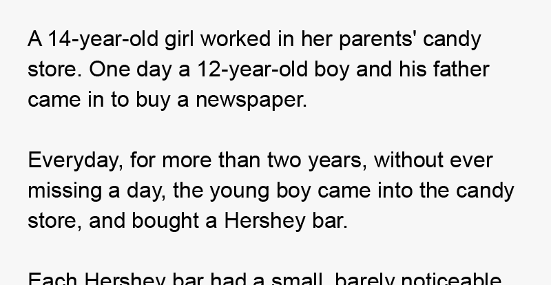 Everyday, for more than two years, without ever missing a day, the young boy came into the candy store, and bought a Hershey bar.