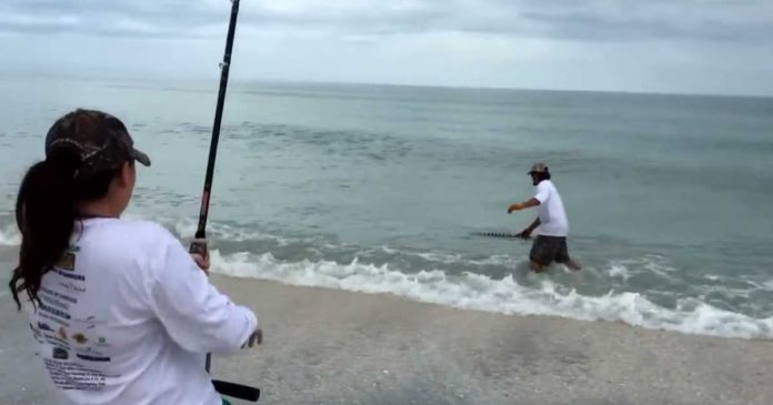 Apparently, the couple in the video casted their line into the shallow surf of the beach. Ordinarily, all you’d catch in the beach surf is some shellfish and other smaller wildlife. But this couple managed to catch something huge.