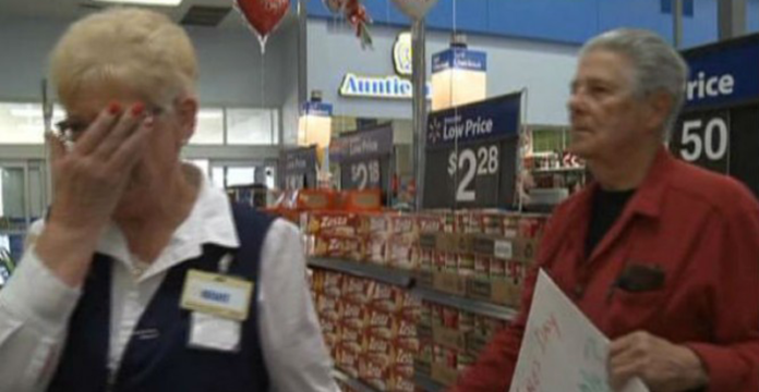 Stumpf, 75, was working her shift at Walmart when a man approached her with a large sign. When she turned around she was shocked to see her ex-husband, and even more taken back with the sign he was holding. It read: “Happy Valentines Day. Will you marry me?”