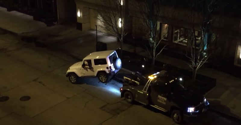 “I saw the tow truck backing up to my Jeep, so I walked up and let him know, ‘Hey, I’m moving it,'” Victor told the Huffington Post. “He decides to lift it up anyway and take off with it … and my dog.”