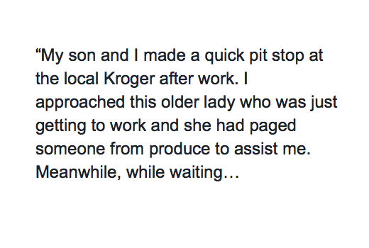 A mother posted this heartwarming story online, after an encounter with a employee at a local Kroger supermarket. In her Facebook post, Katie Deulina describes approaching the employee for help after her child accidentally spilled some fruit, but what the employee did to her son afterwards left her speechless.
