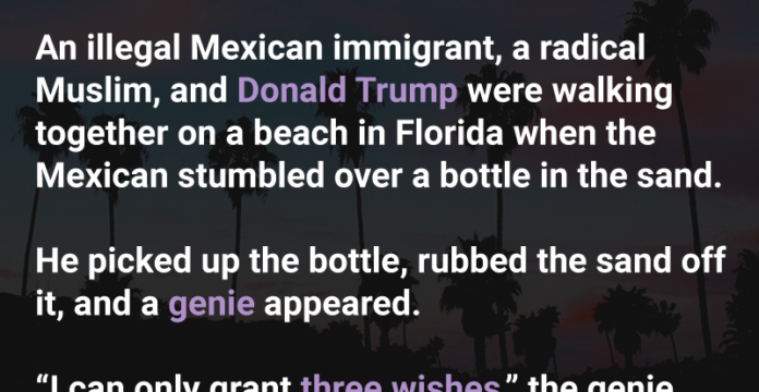 An illegal Mexican immigrant, a radical Muslim, and Donald Trump were walking together on a beach in Florida when the Mexican stumbled over a bottle in the sand.