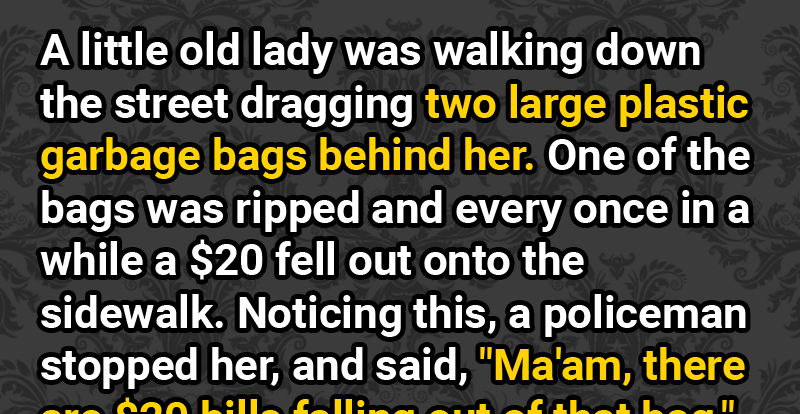 Noticing this, a policeman stopped her, and said, “Ma’am, there are $20 bills falling out of that bag.”