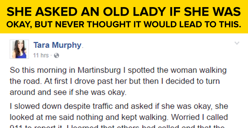 A woman recently spotted an elderly woman walking alone on the road. Concerned, she asked the woman where she was going and offered her a ride. The young woman posted this on Facebook, describing her experience shortly afterwards. Read her post below.