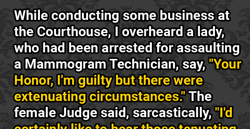 The female Judge said, sarcastically, “I’d certainly like to hear those extenuating circumstances.” I did too so… I listened as the lady told her story.