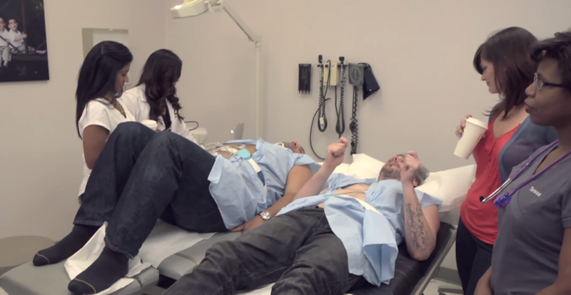 The two men were hooked up to a labor pain simulator by the doctors. The simulator works by sending electrical current through pads that are attached to the skin. Apparently it’s the closest thing to childbirth pain you can get to without being pregnant.