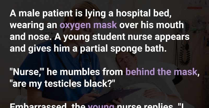 “Nurse,”‘ he mumbles from behind the mask, “are my testicles black?”