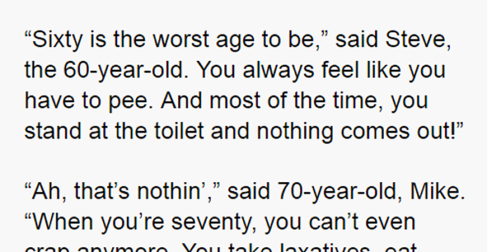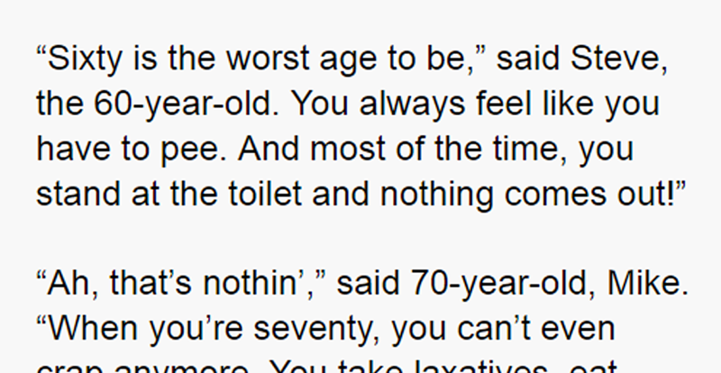 “Ah, that’s nothin’,” said 70-year-old Mike. “When you’re seventy, you can’t even crap anymore. You take laxatives, eat bran, you sit on the toilet all day and nothin’ comes out!”