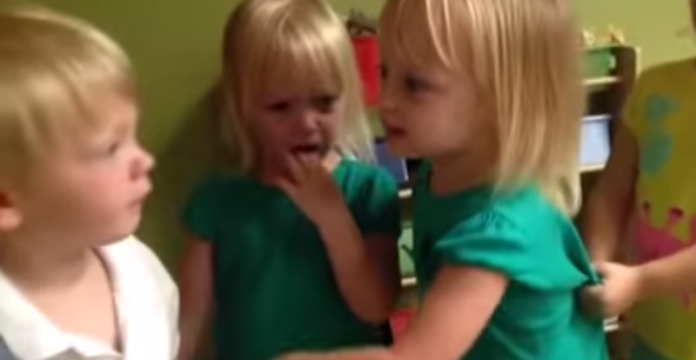 The debate escalates as the girl pokes the boy in the eye. Fortunately, the child in the middle is a born peacemaker, telling her sister to apologize and also making sure the boy isn’t hurt. The calm didn’t last for long as the argument continues. Clearly, this is the argument of the ages. It finally comes to a halt when the girl pokes the boy on the chest.