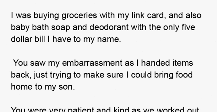 I was buying groceries with my link card, and also baby bath soap and deodorant with the only five dollar bill I have to my name. I had checked my card balance before I got to the store and thought I had $120, but as I found out at the checkout aisle, the number wasn’t up to date and I only had $70. You saw my embarrassment as I handed items back, just trying to make sure I could bring food home to my son.