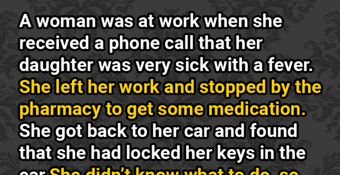 The man got out of his car and asked her if he could help. She said, “Yes, my daughter is very sick. I stopped to get her some medication and I locked my keys in my car. I must get home to her. Please, can you use this hanger to unlock my car?”
