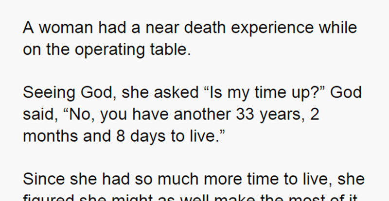 Seeing God, she asked “Is my time up?” God said, “No, you have another 33 years, 2 months and 8 days to live.”