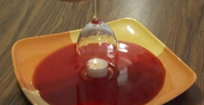 The trick is very simple. To perform it, you need a candle, a plate, a wine glass, and a liquid inside the wineglass. If you can’t get ahold of a candle (like at a bar for example) you can use a red cherry stem.