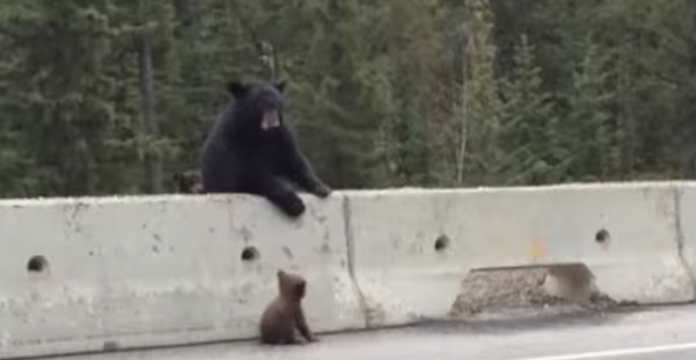 The cub didn’t look too disturbed, but he was in grave danger. After a while, the mother bear appeared from behind the concrete divider and grabbed her cub by the scruff of his neck. He complained, but she probably saved him from a lethal accident.