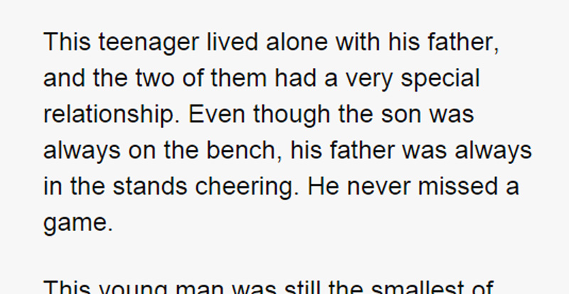 This teenager lived alone with his father, and the two of them had a very special relationship. Even though the son was always on the bench, his father was always in the stands cheering. He never missed a game.
